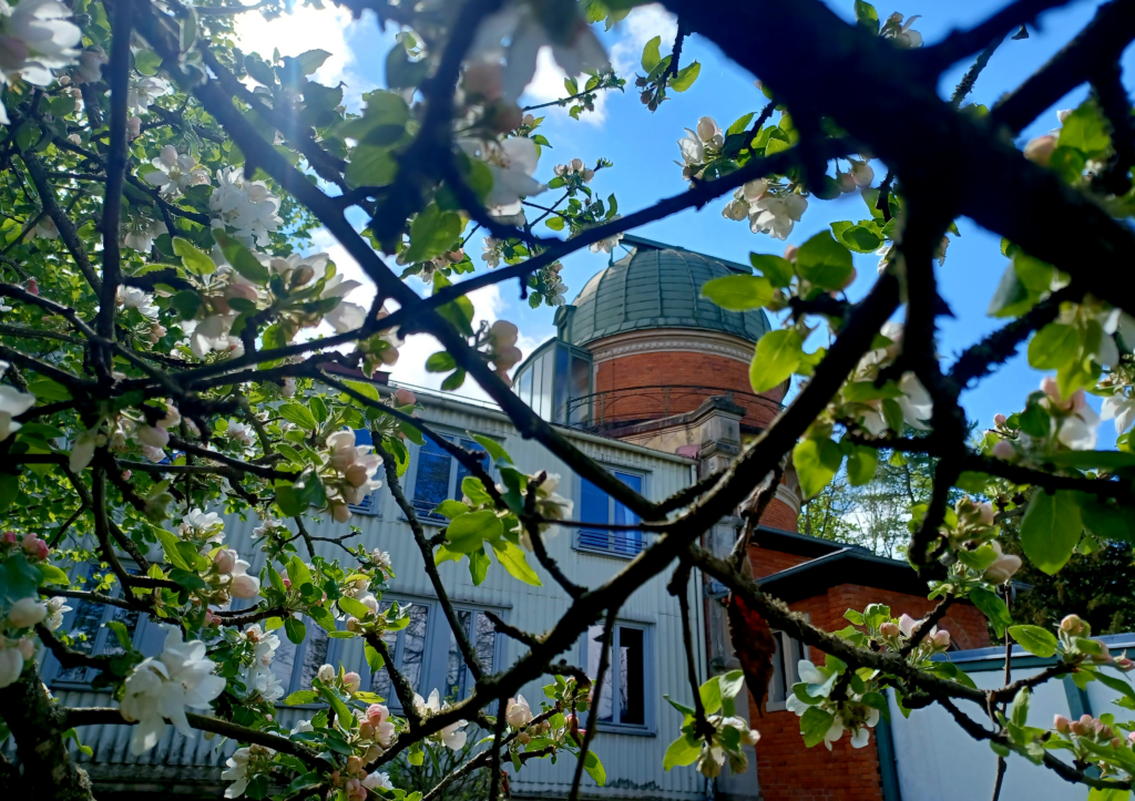 The image shows a view of the Remeis Observatory’s Meridian building on the left and the west dome on the right,  with some blooming tree branches in the foreground.