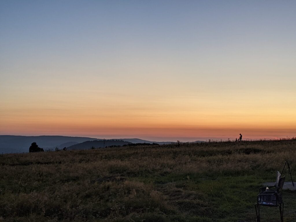 Das Bild zeigt einen Sonnenuntergang über der Rhön, einem Mittelgebirge in Zentraldeutschland an den Grenzen von Bayern, Hessen und Thüringen, weit entfernt von größeren Städten. Folglich ist die Lichtverschmutzung in der Rhön eine der niedrigsten in ganz Deutschland, was das Mittelgebirge zu einem idealen Ort für astronomische Beobachtungen macht. Die Lichtverschmutzung in einer Region kann mit Hilfe der sogenannten Bortle Skala quantifiziert werden.  Diese reicht von Bortle Klasse 1 bis Klasse 9, wobei eine niedrigere Zahl einer niedrigeren Lichtverschmutzung entspricht. Die Rhön lässt sich auf dieser Skala zwischen 3 und 4 einordnen, was für Zentraleuropa sehr gering ist. Das hier gezeigte Foto wurde während einer von Mitgliedern der Remeis Sternwarte unternommenen Exkursion in die Rhön aufgenommen, um unter anderem mit einem der mobilen Linsenteleskope der Sternwarte zu beobachten.