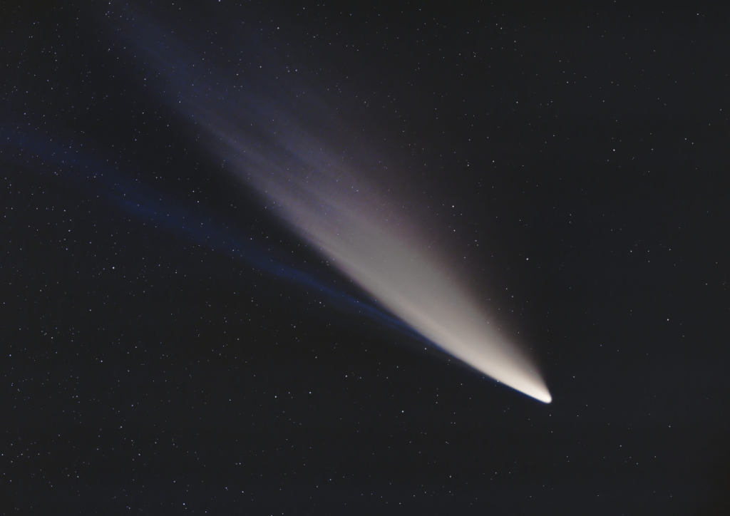 The image shows the famous comet C/2020 F3, better known as NEOWISE named after the NASA mission, during which the comet was first discovered in March of 2020. In summer of 2020, it was even visible with the naked eye in the northern hemisphere.