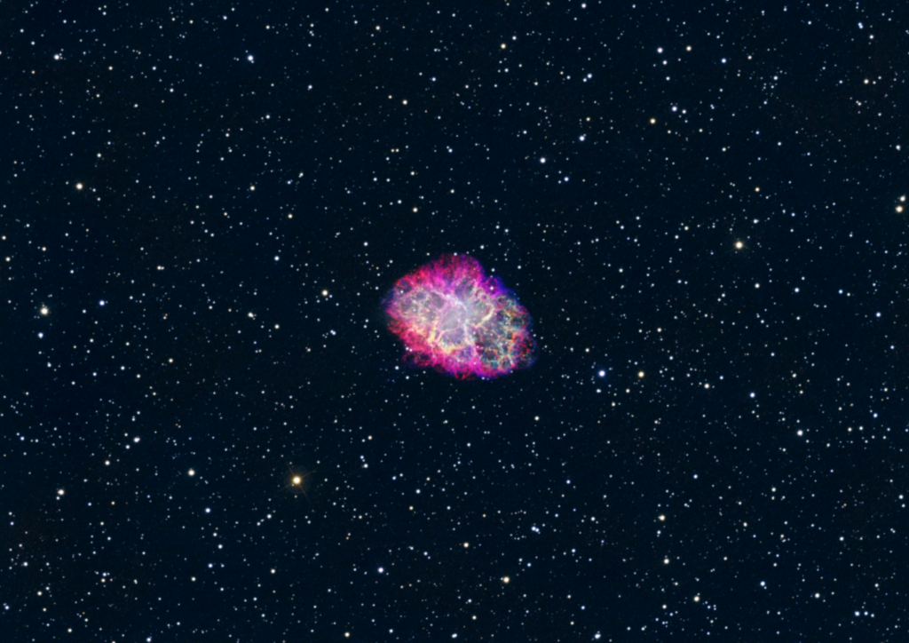 The Crab Nebula, also known as Messier 1 (M1), is a supernova remnant/pulsar wind nebula located in the Taurus constellation about 6500 light-years from Earth. When a star with more than eight times the mass of our Sun depletes the hydrogen it is burning in its core, it reaches the final stage of its life and ultimately explodes in what we call a core-collapse supernova. The resulting shock wave expands into the surrounding medium, heating it up and producing bright emission across the electromagnetic spectrum. At the centre remains a dense neutron star, which in this case ejects fast, charged particles from the polar regions of its strong magnetic field. Because its rotation axis and magnetic field axis are  not aligned, the beam periodically points toward us, making it appear to “pulse”. This is why we call such an object a pulsar. These energetic charged particles form a wind that significantly influences the dynamics in the interior of the remnant, hence the name pulsar wind nebula. In the image, there is a small patch of diffuse emission (whitish in the image) visible, which corresponds to the pulsar wind nebula in the centre of M1. In X-ray observations the emission would appear much brighter than in the optical image shown here.