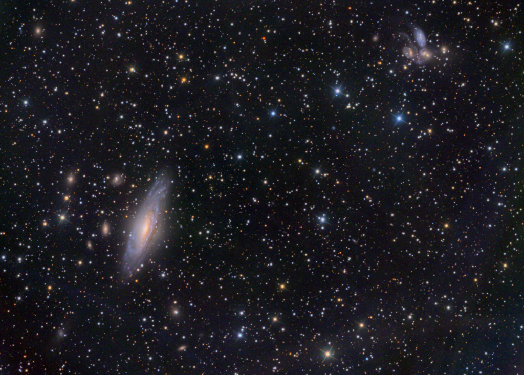 Nach aktuellen Theorien zur Strukturbildung im Universum bilden sich kleinere Objekte zuerst, die sich zu immer größeren Strukturen zusammenschließen: Sterne zu Galaxien, Galaxien zu Gruppen und Gruppen zu Haufen. In der oberen rechten Ecke des Bildes sind fünf weitere Galaxien zu sehen, bekannt als Stephan’s Quintett. In der Astrofotografie werden NGC 7331 und Stephan’s Quintett oft zusammen aufgenommen, da sie am Himmel nahe beieinander erscheinen. In Wirklichkeit befinden sich all diese Galaxien jedoch in völlig unterschiedlichen Entfernungen.