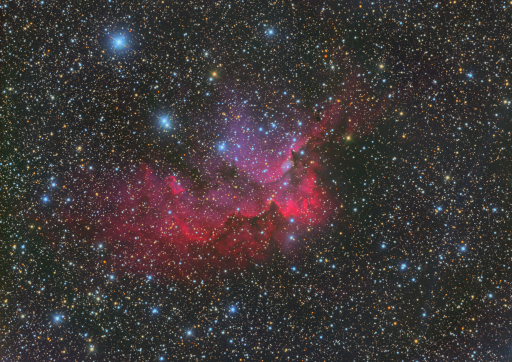 Die diffuse Emission, die den Nebel um den Sternhaufen herum bildet und im Bild in rosa und rot sichtbar ist, wird üblicherweise als „Wizard Nebula“ bezeichnet. Ähnlich wie bei den Prozessen, die zuvor im Abschnitt zum Rosettennebel beschrieben wurden, ionisieren die massereichen Sterne ihre Umgebung. Durch Rekombination wird Licht im roten Teil des elektromagnetischen Spektrums emittiert.