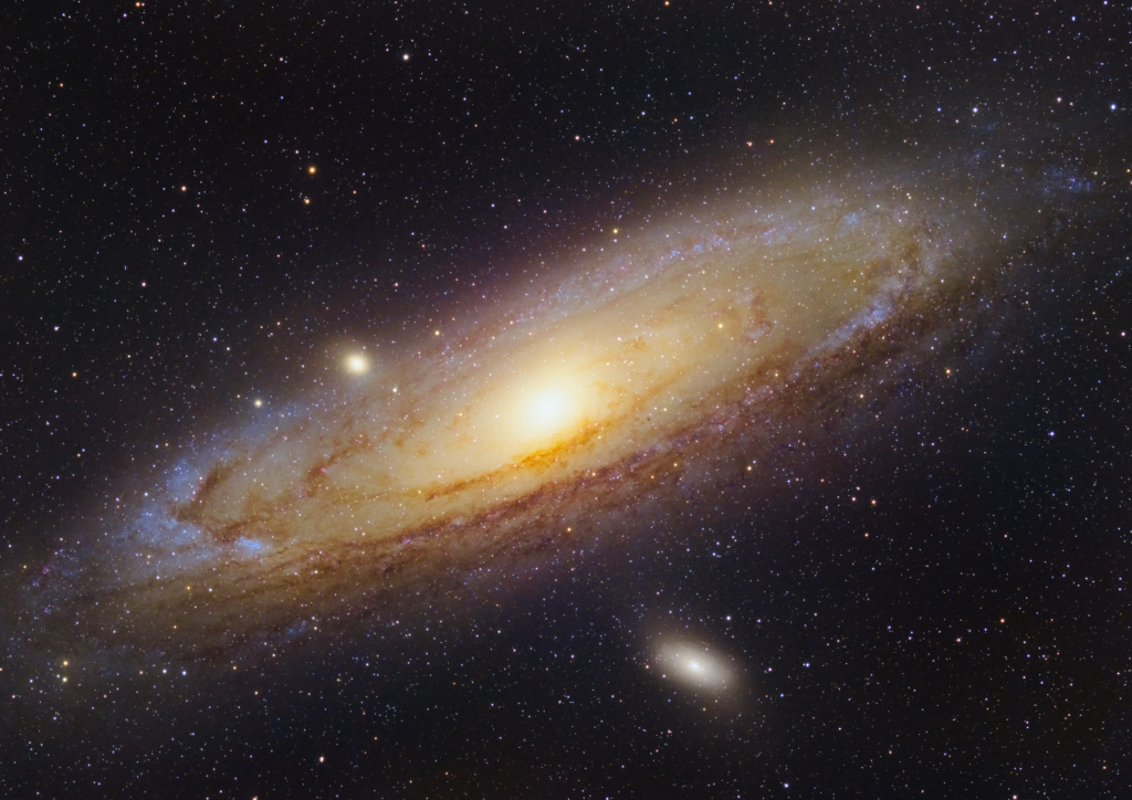 M31, besser bekannt als Andromeda, ist eine weitere Galaxie in der Lokalen Gruppe, ca. 2.5 Millionen Lichtjahre von uns entfernt. Genau wie M33 ist auch Andromeda eine Spiralgalaxie. Allerdings sehen wir sie wegen ihrer höheren Inklination eher von der Seite, weswegen die Spiralarme weniger deutlich sichtbar sind. Genau wie in M33 kann ein farblicher Unterschied zwischen dem zentralen Bereich, in welchem sich eher ältere Sterne befinden, und dem äußeren Bereich der Galaxie, in dem die Sterne größtenteils eher jünger sind, festgestellt werden. Die dunklen Streifen, welche sich durch die Galaxie ziehen, stechen ebenfalls hervor. Diese werden durch Staub in der galaktischen Scheibe verursacht, welcher das Licht der Sterne abschirmt.