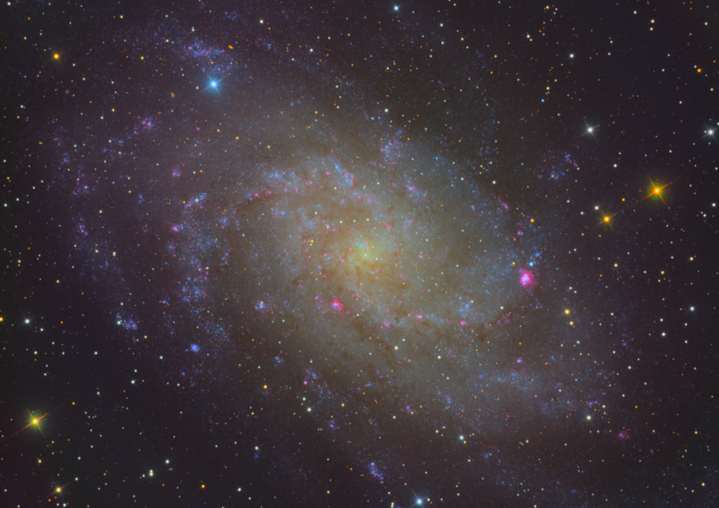 M33, auch bekannt als Dreiecksgalaxie, ist eine Spiralgalaxie in der sogenannten Lokalen Gruppe, zu der unter anderem auch unsere Milchstraße gehört. Mit einer Entfernung von 2.9 Millionen Lichtjahren ist M33 noch relativ nah an der Milchstraße. Genau wie unsere eigene Galaxie ist M33 eine Spiralgalaxie. Wegen ihrer Inklination sehen wir sie nahezu frontal, sodass die Spiralarme besonders gut zu erkennen sind. Im Bild ist ein klarer farblicher Unterschied zwischen dem zentralen Bereich von M33 (gelblich) im Vergleich zu den Randbereichen (eher bläulich) zu erkennen. Das liegt am unterschiedlichen Alter der Sterne, älter im Zentrum und jünger in den äußeren Bereichen der Galaxie. Des Weiteren handelt es sich bei den zahlreichen rötlich erscheinenden Stellen, die sich in den Spiralarmen verteilt befinden um sogenannte Sternentstehungsgebiete, das bedeutet besonders dichte Regionen, in denen neue Sterne geboren werden.